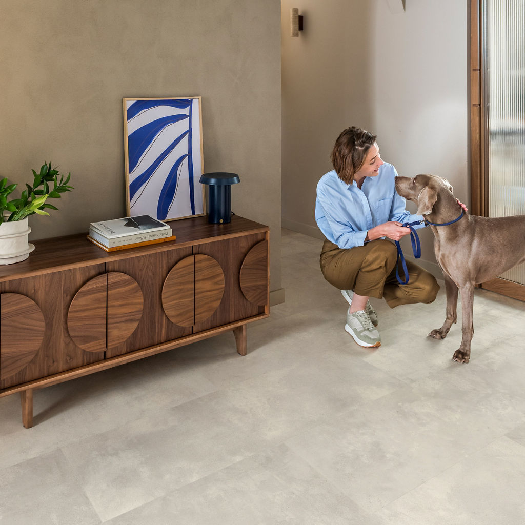 De Gevlekt beton laminaatvloer in lichtgrijs combineert de uitstraling van echt hout met het gebruiksgemak waar Quick-Step om bekendstaat. Deze vloer vormt een stabiele en stijlvolle basis voor zowel moderne als klassieke interieurs.