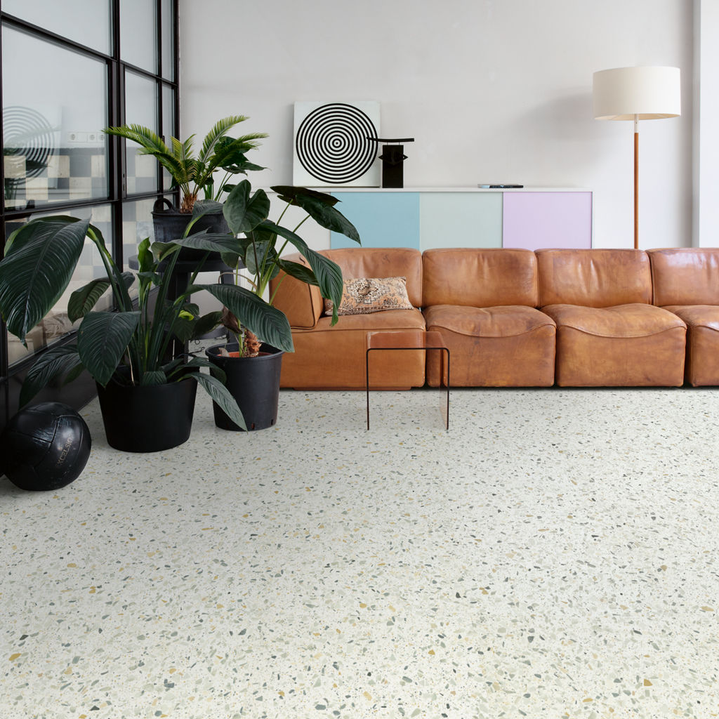 De Terrazzo multicolor – PVC Plak PVC vloer in veelkleurig is ontworpen voor een strak en duurzaam resultaat. Dankzij de stabiele opbouw en slijtvaste toplaag is deze vloer geschikt voor intensief dagelijks gebruik.